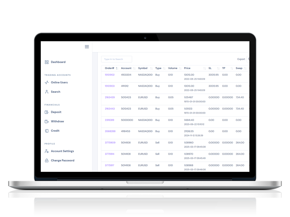 Simple, easy to use, and highly functional — our Trader’s Cabinet gives your clients complete control and transparency. Partner with us to deliver the ultimate trader experience.